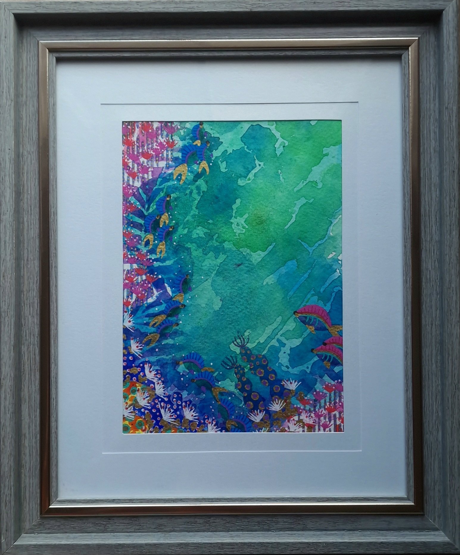 Watercolor with gel and gold, painted with oceanwater