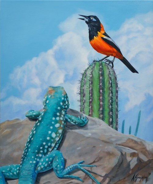 Armando Goedredrag, Tension/Trupial and Kadodo Aruba, 50x60cm, Acrylic on Canvas, 2025